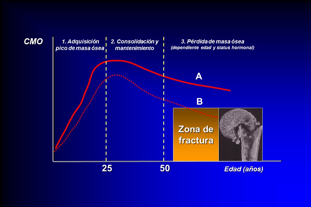 Figura 2 - Evolución de la masa ósea desde el nacimiento a la edad adulta. A: Población normal. B: Población con osteopenia iniciada en la infancia y/o adolescencia