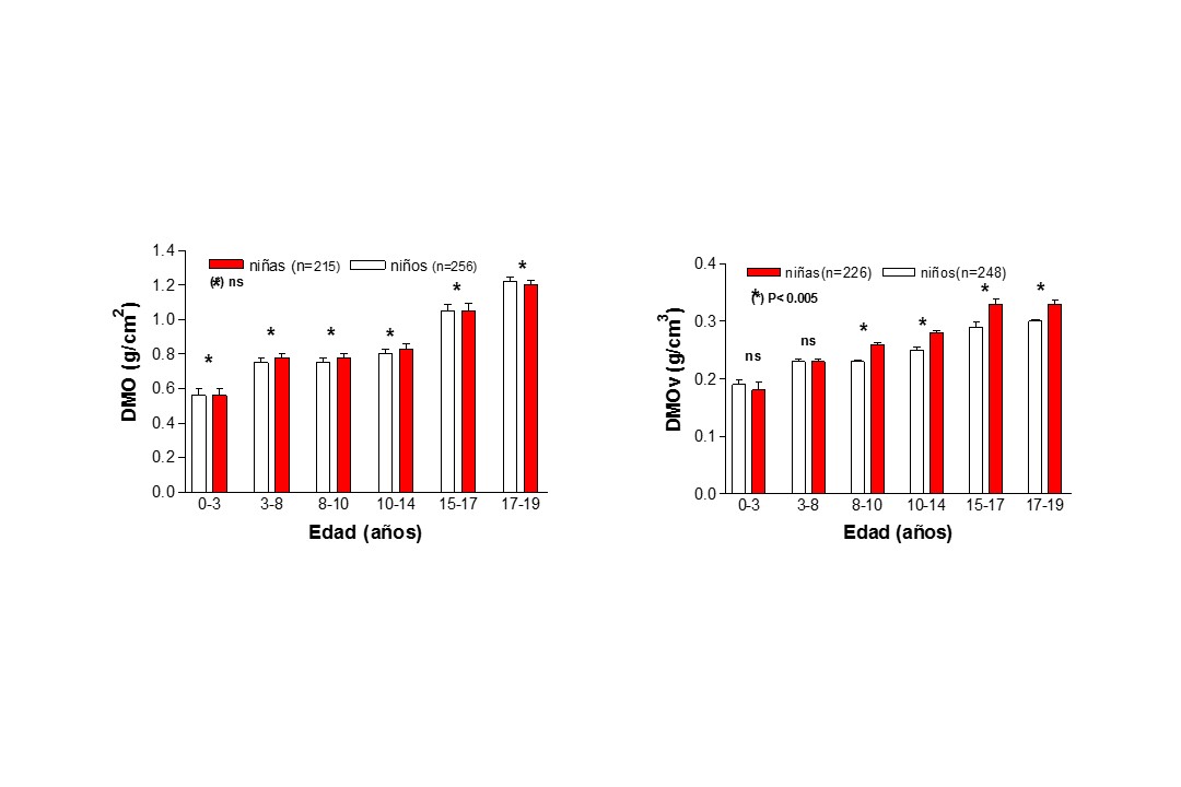 Figura 4 - Valores de densidad mineral ósea y a nivel de columna vertebral (L2-L4) en nuestra población en función de la edad y sexo