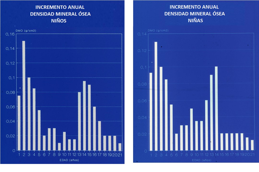 Figura 6 - Incrementos anuales de densidad mineral ósea en la infancia y adolescencia. Los tres primeros años de la vida y la adolescencia son las etapas de mayor depósito de sales minerales en el esqueleto en desarrollo