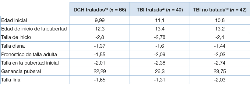 Tabla 6 - Estudio comparativo de los resultados de talla final en un grupo de niños con talla baja idiopática de evolución espontánea, un grupo de talla baja idiopática tratados con GH y un grupo de niños con déficit de GH tratado con GH