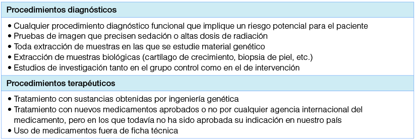 Tabla 3 - Procedimientos diagnósticos y terapéuticos en endocrinología pediátrica en los que se recomienda disponer de un documento de consentimiento informado